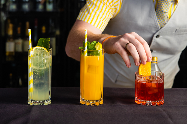 Our package includes a professional bar counter setup, bartenders, glassware/cups, garnishes, and all mocktail ingredients.